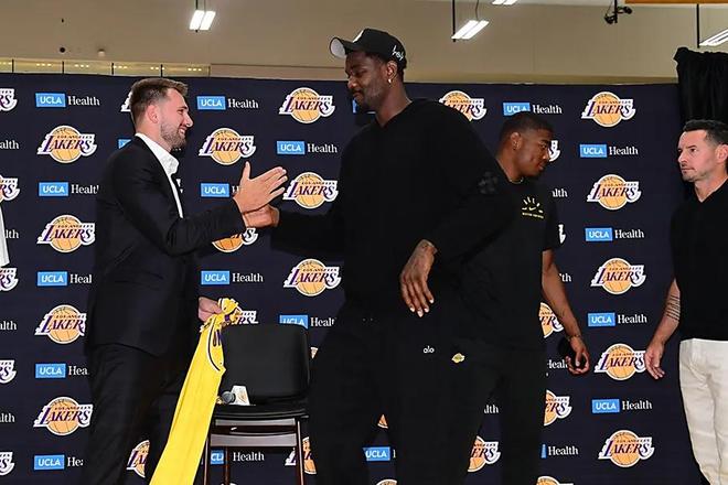 赛前,湖人有两套阵容,一套是打不了阵容。其中东契奇轮休、克勒贝尔四头肌伤势、詹姆斯臀部肌肉伤势、斯玛特跟腱伤势和新秀蒂耶罗膝盖伤势,五人全部缺席。另一套,就是今天的比赛首发阵容了:里夫斯、拉拉维亚、范德比尔特、八村塁、艾顿。